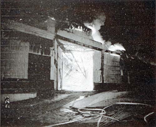 Boat Tender No. 2 using lines from hydrants was backed through a fire door