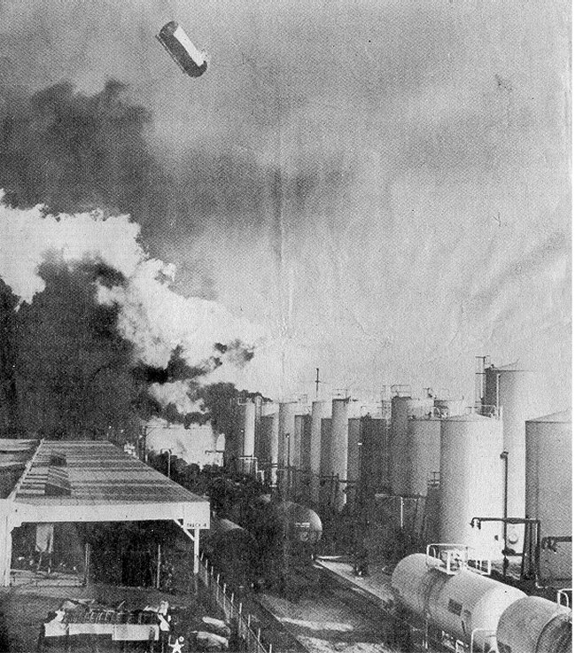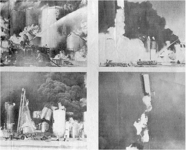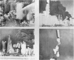 lower right photo, the flaming tank is nearly 300 feet in the air. More than 100 firemen