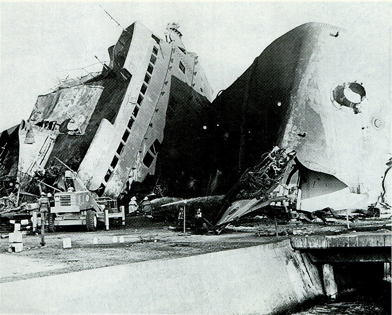 poop deck and tried to calm the excited crew who were milling about. As the ship was moving outward from the dock, putting a great strain on the mooring lines, Captain Hood concentrated on keeping the crew clear of these in case they should part. Captain Bovone had a line hung from the rail to the water so that the men could climb down. Within 16 minutes all hands had left the stern section, followed by Captain Bovone. 22. At the time of the explosion Lamar White was sitting in the terminal control room, where he could see only the after part of the vessel--nothing forward of the after deckhouse. Manuel Carrillo was in the rear of the control room. Just prior to the explosion everything was normal. Something attracted White's attention on the dock itself, he looked out and saw a blast--a "heat wave"--coming toward him (the appearance of air and dust). White was knocked out of his chair and onto the floor, as all the windows were blown in. Before he could get up, a second "blast" was heard as the roof fell in. White helped Carrillo up and they both ran out of the control room and away from the vessel. 23. Summary of Eyewitness Testimony a. Eyewitnesses observed various stages of the explosion from several locations, including the nearby boatyard, two private aircraft at an altitude of 1800 feet and a range of 5 miles, the Coast Guard Cutter VENTUROUS in the Los Angeles entrance channel, a small boat in the harbor at a range of 400 yards, a roadway a half-mile across the harbor, and from various homes within a distance of 1 to 3 miles. These eyewitnesses generally saw two explosions, the second being of much greater intensity. Only two of the eyewitnesses interviewed actually observed large portions of the vessel traveling through the air. Several witnesses observed an initial flash occurring over the tank deck abaft the midship deckhouse. Several witnesses reported seeing a fire at the instant of or just before the second larger explosion. Two witnesses testified to seeing, before the explosion, what they thought was a vapor cloud or smoke over the midship house and the port bow area. One nearby witness observed two crewmembers running from abaft the midship house, on the starboard side, diagonally aft toward the catwalk, immediately prior to the explosion. b. In march 1977 additional testimony was received after the media reported the possibility of a bomb having made a hole in #3 port cargo tank. One witness testified that he had observed what he thought was a flare fired from a small aircraft carrier (the ex-USS HANCOCK) being dismantled at Berth 53, a half-mile from the SANSINENA. He said the flare went in the general direction of the 12 |