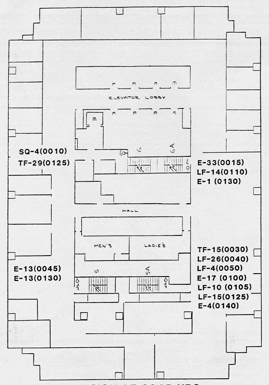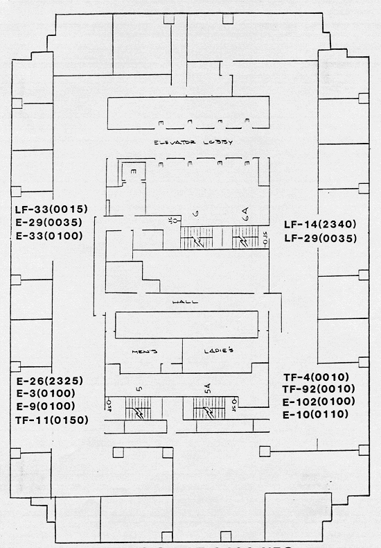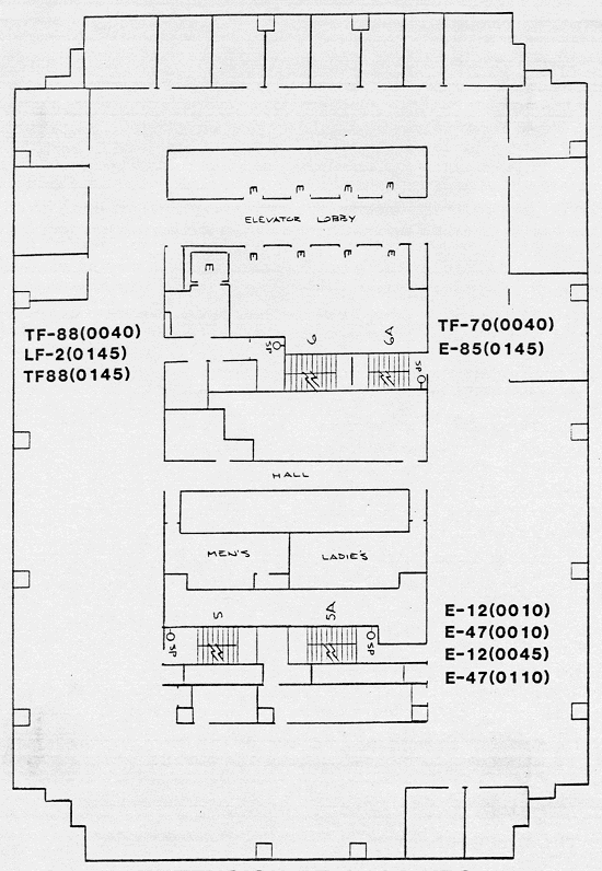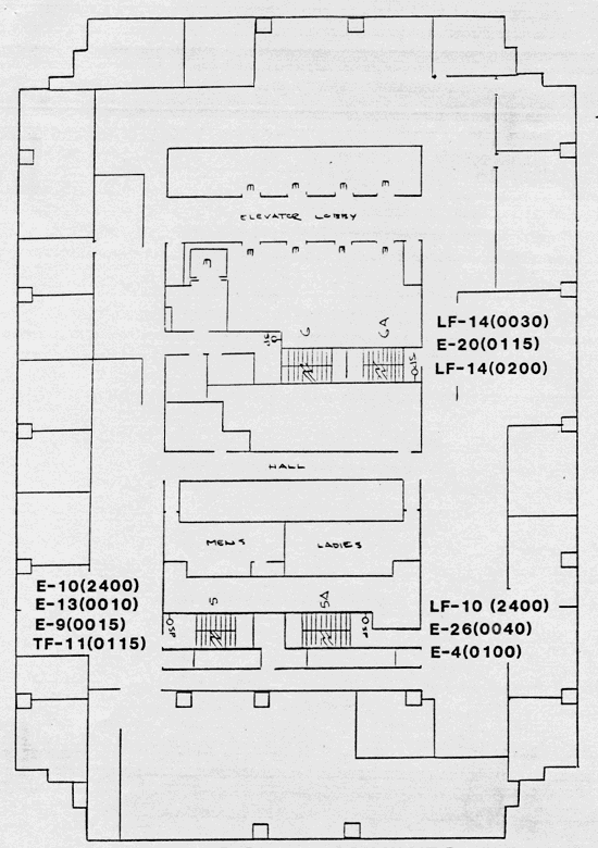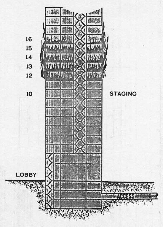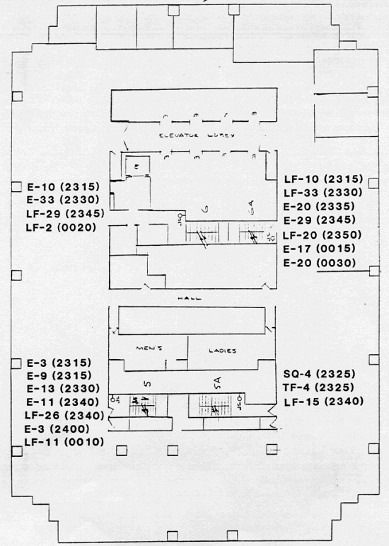 -9- At 0130 hours, the 15th floor was fully involved with fire and was starting to expose the 16th floor. The offices in the north end of the 16th floor were starting to burn due to extension of the fire through the space between the floor and the glass curtain wall exterior. Division 3 and Battalion 10 (Chief Perez) directed Engine 12, Engine 47, Task Force 70, and Task Force 88 in protection of the 16th floor as the companies working below made an all out assault on the 14th and 15th floors. The fire was officially declared "knocked down" at 0219 hours. At that point, water control and salvage operations were started under Chief Vega and Chief Young's directions. Search and rescue efforts continued until all people were removed from the building and transported to local hospitals. |