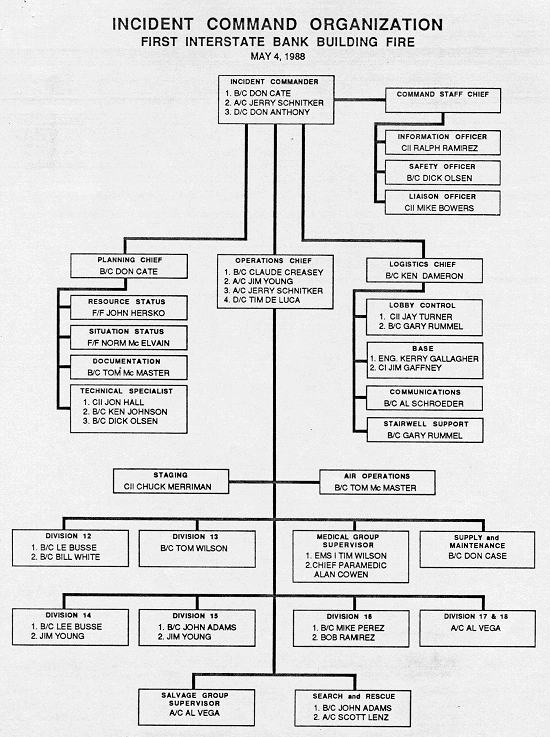 Battalion Chief The following is a description of the Los Angeles City Fire Department's high rise Incident Command System (ICS) as it was implemented at the First Interstate Bank building fire. A complete description of the high rise ICS organization is contained in the second part of this chapter. Chief Engineer Chief Engineer and General Manager Donald O. Manning was notified of the First Interstate Bank fire at 2247 hours. Chief Manning arrived on scene at 2315 hours and remained until 0400 hours during which time he oversaw all operations. Incident Commander Battalion