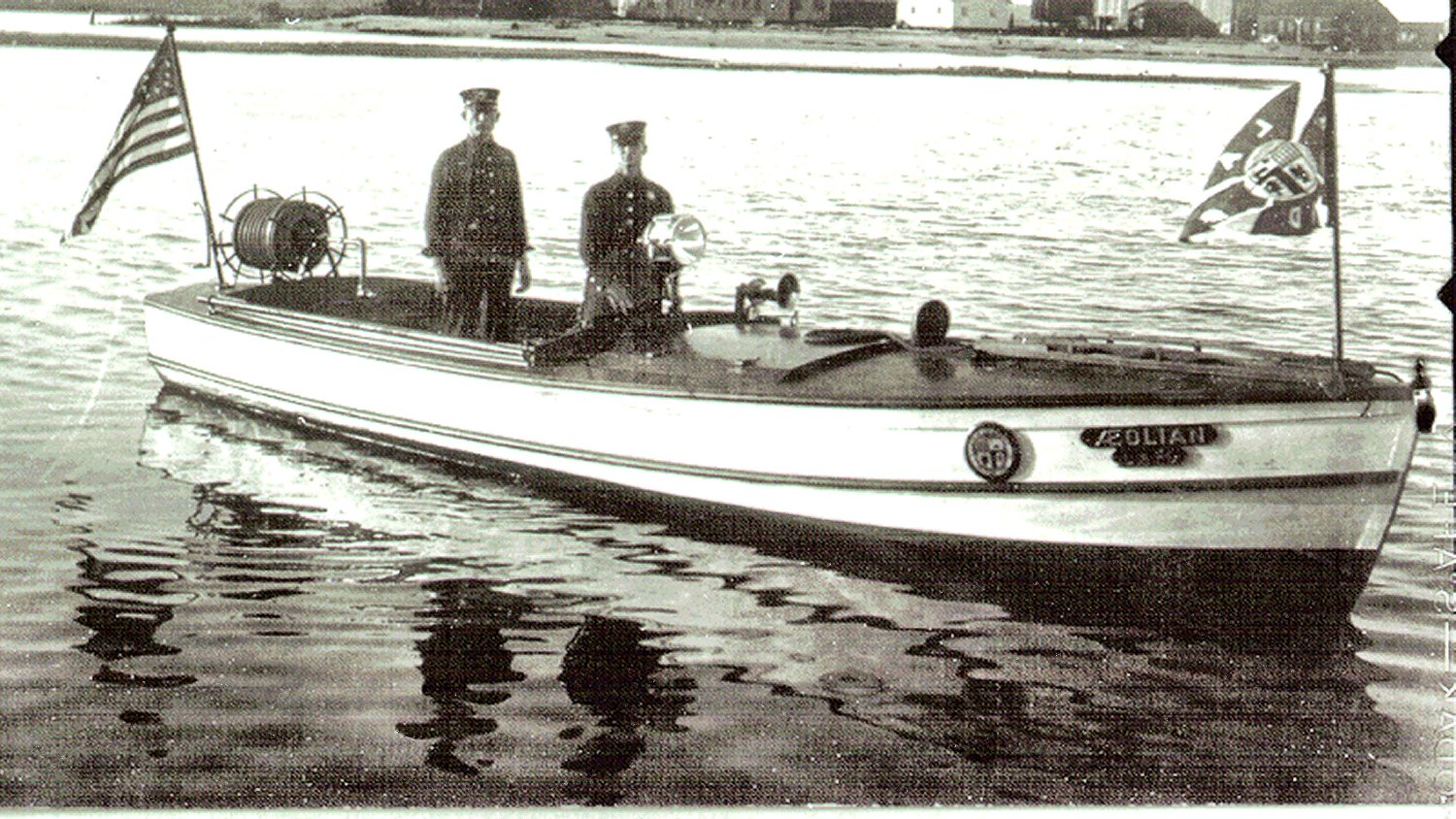 The Aeolian1916 Los Angeles' first fireboat, Aeolian, probably was one-of-a-kind because its sole firefighting capability was a 60 gallon bicarbonate of soda and sulphuric acid chemical supply which, when mixed and discharged through the reeled hose, formed an extinguishing agent. The boat also carried a short ladder for boarding lumber schooners and other vessels. Purchased in 1915 and believed to have been built in Seattle, the 20-foot-long craft went in service in 1916. |
