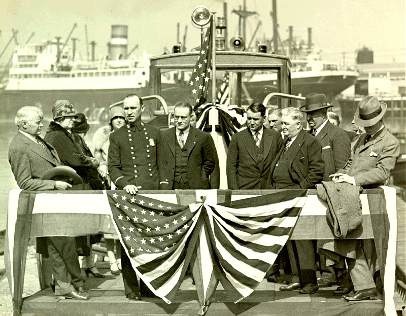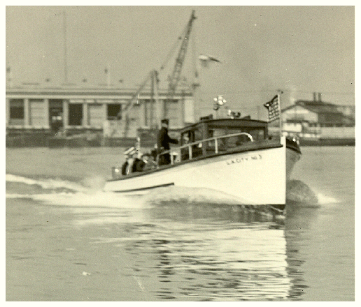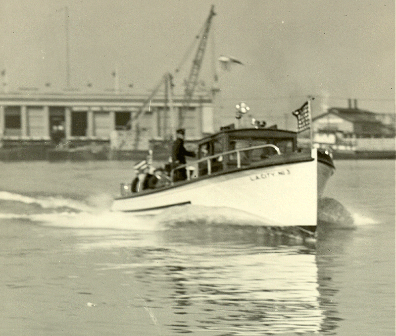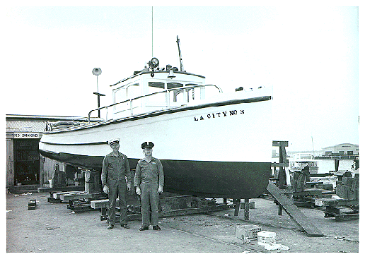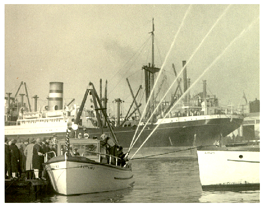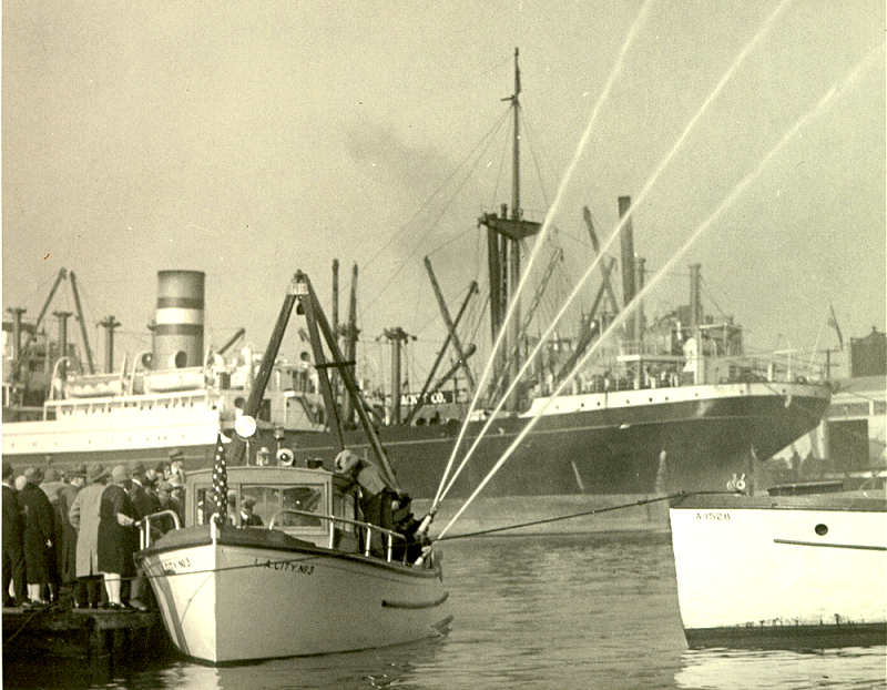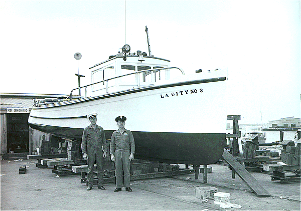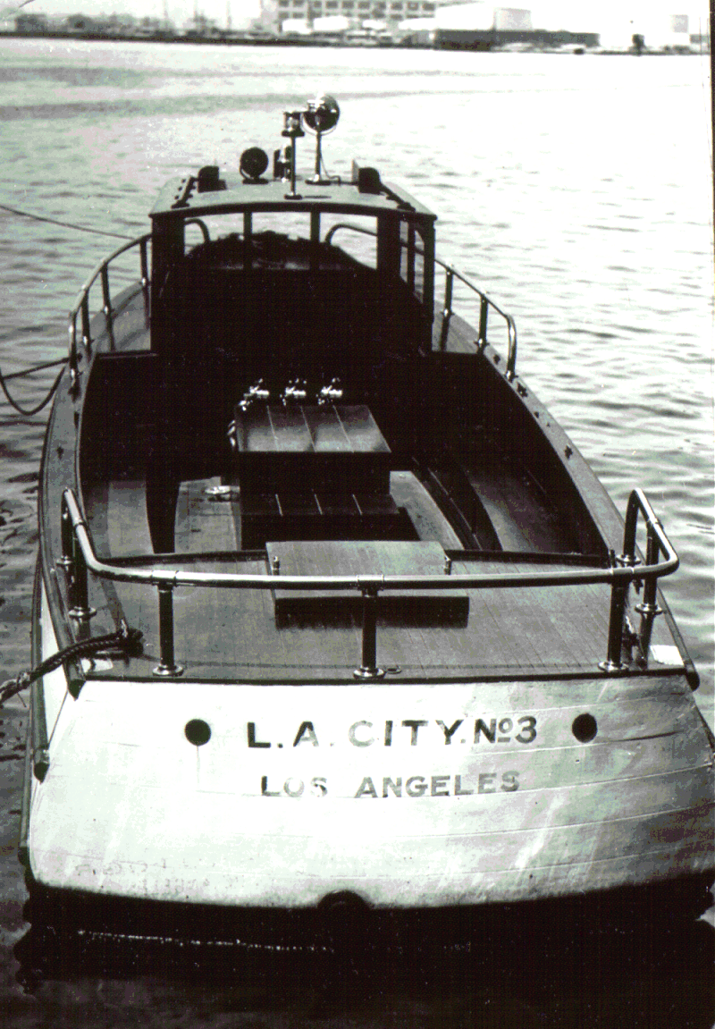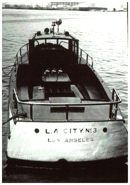 L.A. C I T Y No 3Fire Boat No. 3 was built by the Fellows and Stewart Shipyard at Wilmington. The boat was built as an auxiliary to Fireboat 2 and was moored alongside Boat 2's quarters. Launched March 15, 1928 and commissioned March 22. All wood construction. Length 38' 4", beam 10' 2", draft 2' 6", powered by 275 H.P. Hall Scott Invader. This engine also drives the Byron Jackson centrifugal pump -290 G.P.M. at 125 pounds pump pressure through three outlets and a foam generator. The fuel capacity is 185 gallons. Fire Boat No. 3 carries a foamite generator and 8 cans of foamite powder, MSA hose mask, grappling and drag hooks, 10' roof ladder, two 50 lb. CO-2 tanks with pin nozzle, two type "D" CO-2 and 28 life jackets. |