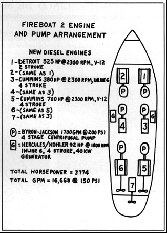 Tremendous credit must be given to all the people involved in this challenging program: to retired Jim Cosgrove; to Bob Finn, Clarence Blaine, Bob Berg, George Jordan and all the staff at Supply and Maintenance; to mechanics Kenny Bacon and Bob Farrier whose high level of craftsmanship guaranteed success; to sheetmetal men Carlos Pena and Jim Araki; to electricians Lyle Anderson and Bill Pickins and blacksmith Larry Boyd; to the men of Fire Station 112 on all platoons; and especially to the dedicated marine engineers assigned to Boat 2. These engineers represent a long line of diligent workers who have labored long hours to keep our fireboats constantly ready for action. They have never really received the credit due them for their sacrificial contributions to the Department. |
