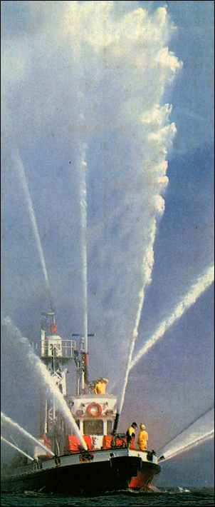 That "was as thrilling as fighint the fires", Dahlquist said. "They'd wake you up at 4:30 in the mornng because a new ship was coming in at 5:30. . . . Away you'd go. You'd try to give 'em a good show. You could barely see with the blanket of water coming down and sometimes you'd throw in sometihing . . . pump all the water to just two of the monitors, 250 feet into the sky." |