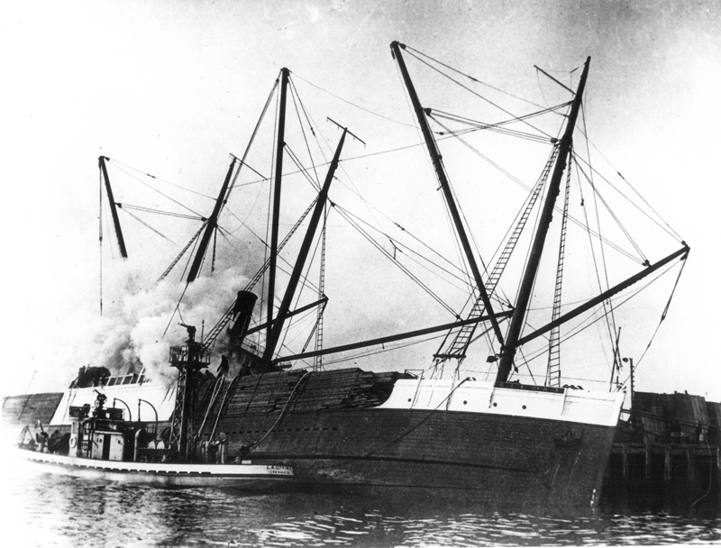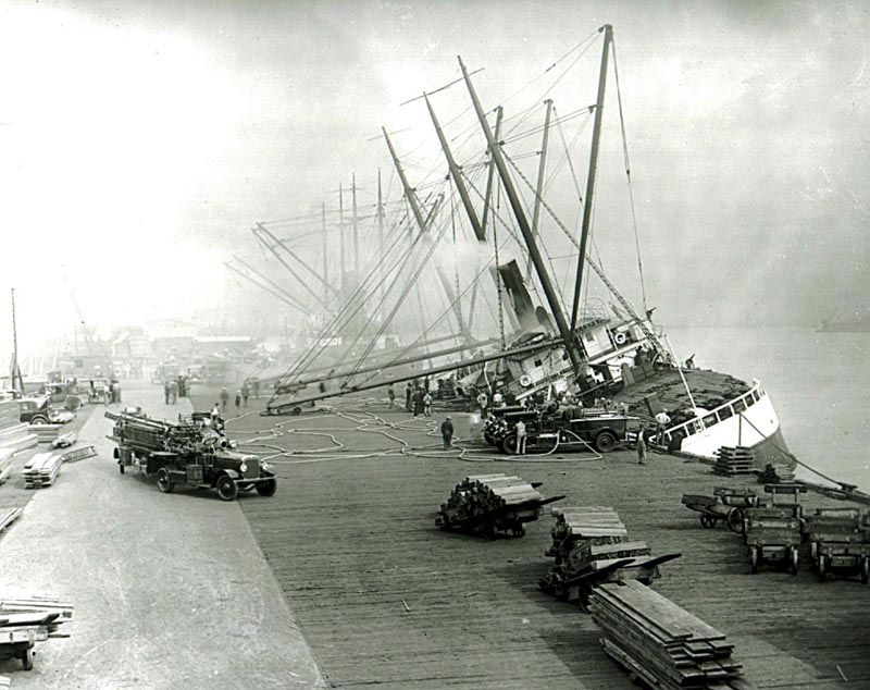 Los Angeles City No. 2 battled its first major fire aboard the fully loaded lumber schooner