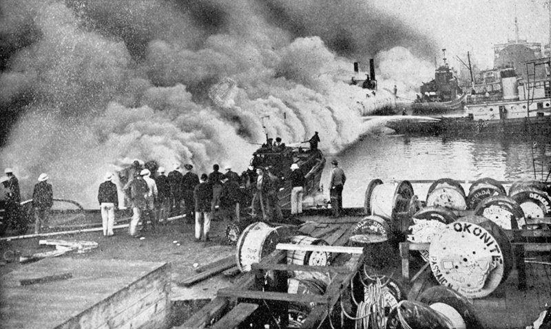 Los Angeles Fire Boat No. 2 responded at 11:27 p.m., December 6, 1945, under the command of Captain Allen. After making a run of a little over four miles Boat 2 went to work operating four 3 1/2-inch rail standee lines and the bow and stern turrets. Long Beach's fire boat was out of service at the time and although there were several other fire boats operating at the time they were mostly Navy tugs with small pump capacity and limited stream appliances. Boat 2 cruised the length of the pier, pouring water from its heavy calibre streams into the well involved creosoted pilings, capping and cross bracing of the structure and although the fire was pretty well knocked down several times there were no provisions for closing in and finishing it off and each time the fire would spring to life anew. At 6:49 a.m. Captain Allen ordered the crew to make ready to return to quarters as all hands were near the point of exhaustion from the better than seven hours of continual fire fighting under heavy smoke conditions.