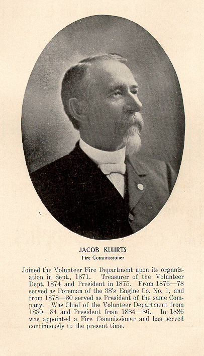 In (the) old volunteer fire department there were many highly interesting characters. Take Jake Kuhrts, for instance. This gentleman has kept up his interest in fire matters to the present day, and as fire commissioner his advice has been invaluable to the body of which he is a member. Many a time has Jake stretched his long legs in racing to fires as a member of the old "Thirty-Eights," setting a pace which many a shorter limbed man had much ado to keep up. Jake is of German birth and began life as a sailor. He is rich and has a rightful claim to be a man of leisure. He is a compound of Nimrod and Izaak Walton, and with gun and rod he puts in his time right pleasantly, keeping an eye on the closed seasons on land and water, and seeing to it that everything goes well with the fire laddies. |