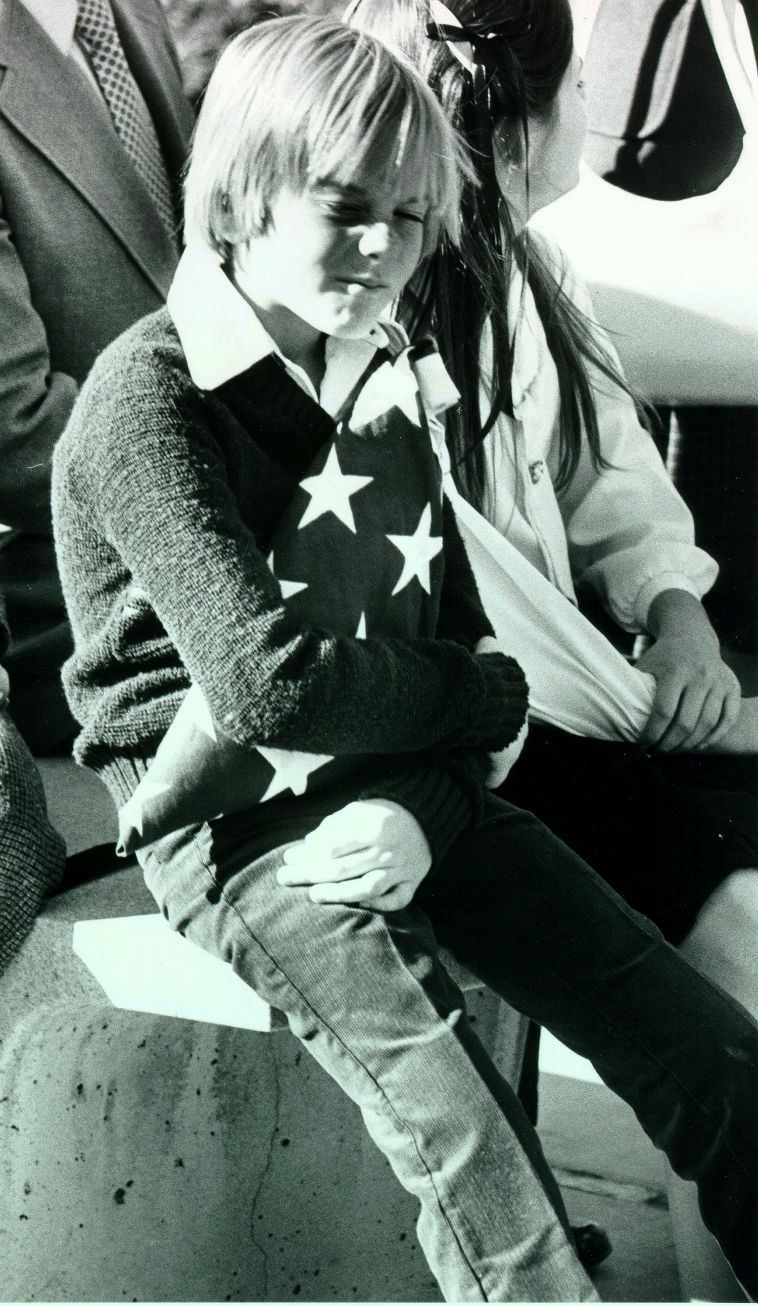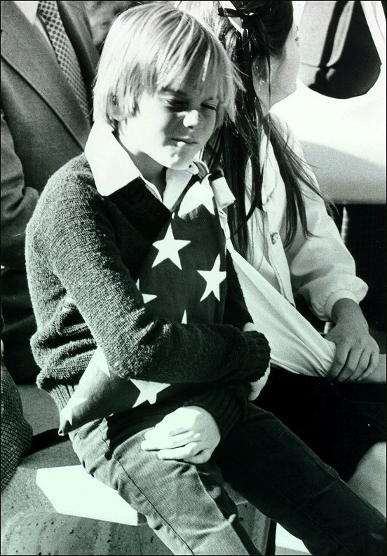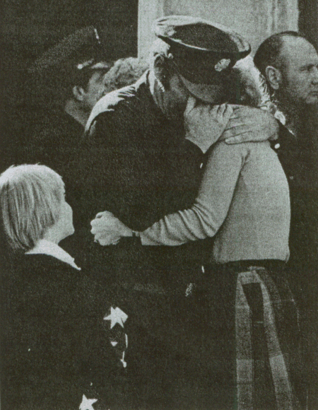 A tearful firefighter consoles Taylor's first wife, Carol Ann, while her nine-year-old son Jason, looks on.