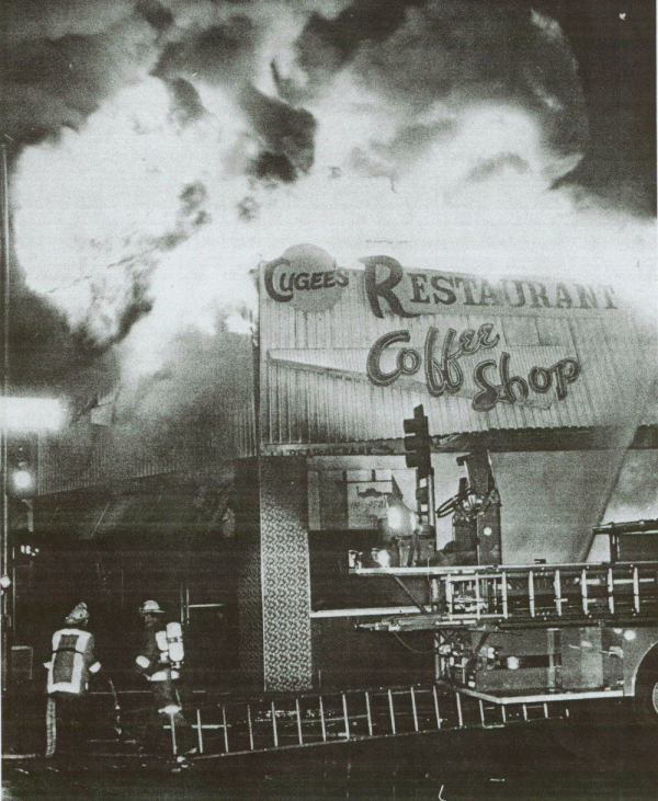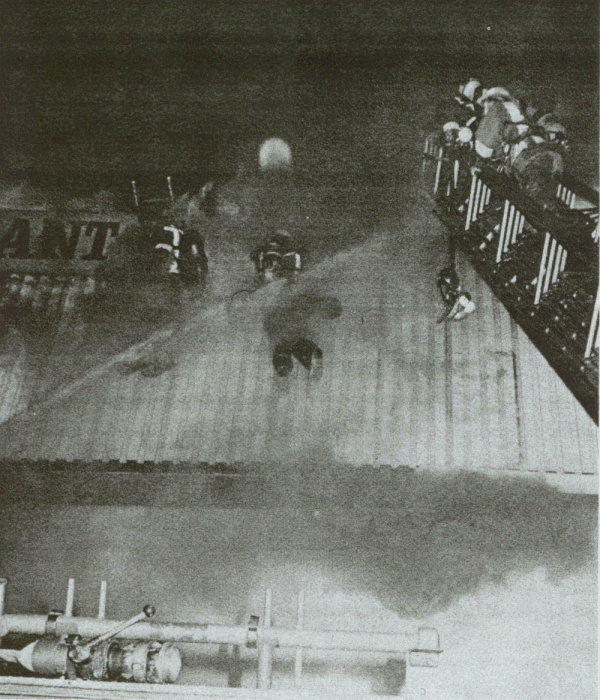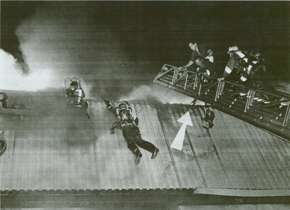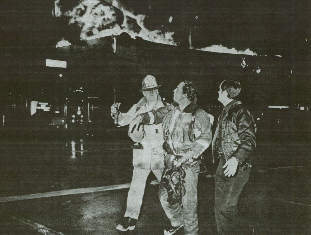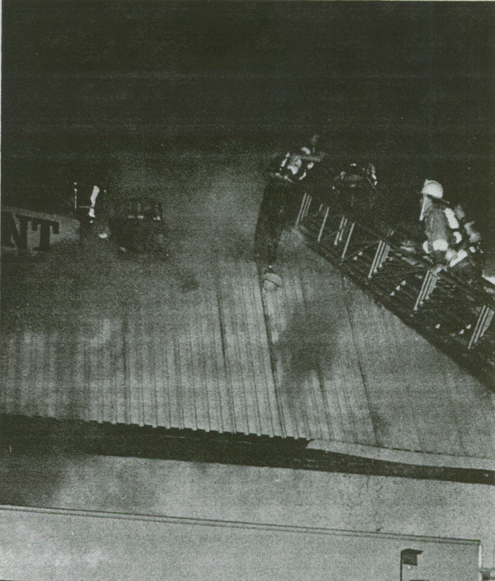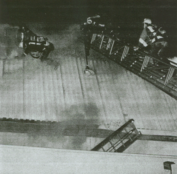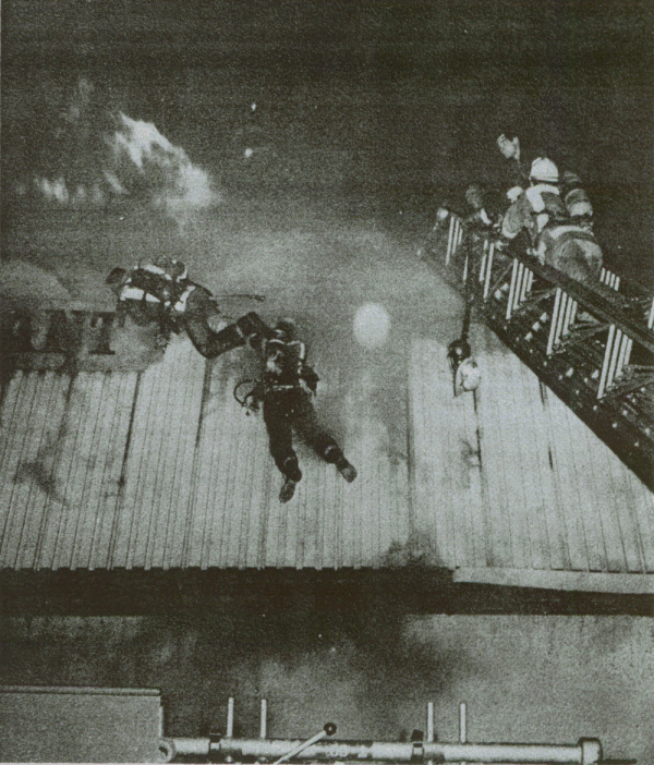 ![]() "COPYRIGHT 1981, BRIAN DIXON" Firefighter Bud Lawson is helped away from fire after being rescued from the roof of burning structure. |