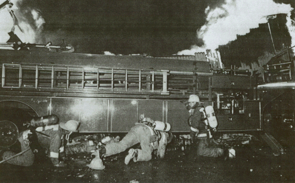 ![]() "COPYRIGHT 1981, BRIAN DIXON" Another heroic firefighter is shown among fallen bricks and debris after pushing fellow firefighter under a cover of a truck. ![]() "COPYRIGHT 1981, BRIAN DIXON" Firefighters dive for cover under truck as the wall collapses. |