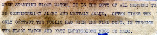 The duty of Floor Watch was an assigned responsibility for all members below the rank of captain. Between the hours of 0800 and 1700 one member, in proper uniform, was assigned to be available in the front of the station for station security and to meet and greet the public.