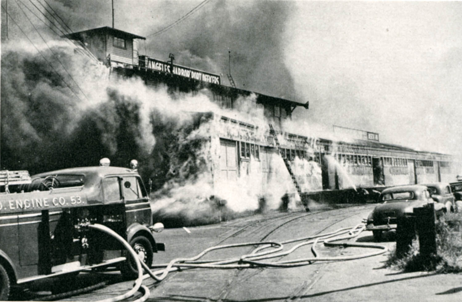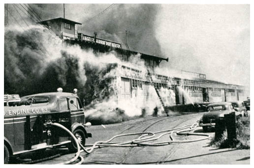 A blaze recently destroyed 800 feet of wharves on the waterfront at San Pedro. Including the structures ruined was the $100,000 Los Angeles Harbor Department wharf. Ten pieces of motor apparatus and three fireboats, aided by Coast Guard cutters and patrol boats, operated on the fire.