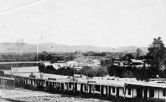 1868 A row of adobes on Los Angeles Street south of Commercial Street belonging to Don Manuel Pequena, in the Nigger Alley area east of the plaza. |