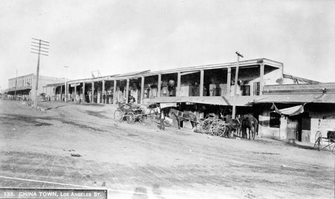 China Town adobes Adobes on Los Angeles Street in Nigger Alley (Calle de los Negroes), formerly owned and occupied by the Mexican owners of the various Los Angeles area ranchos and later occupied by Chinese people. |