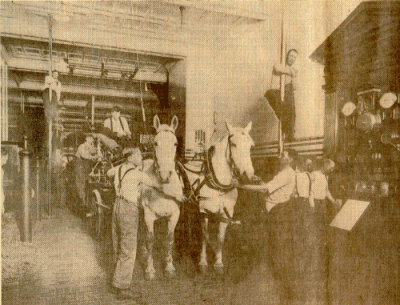 firemen getting horses ready for a fire call.