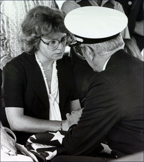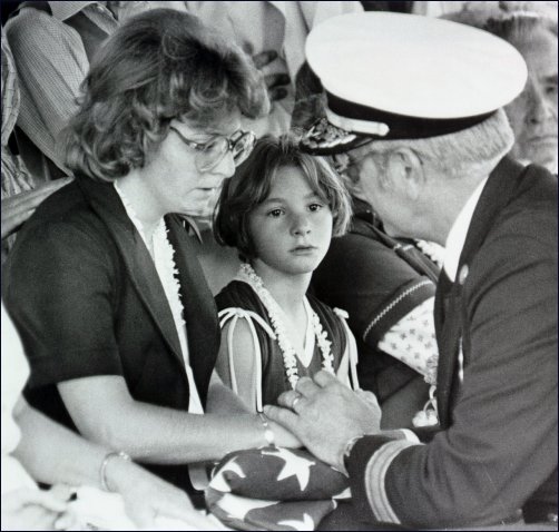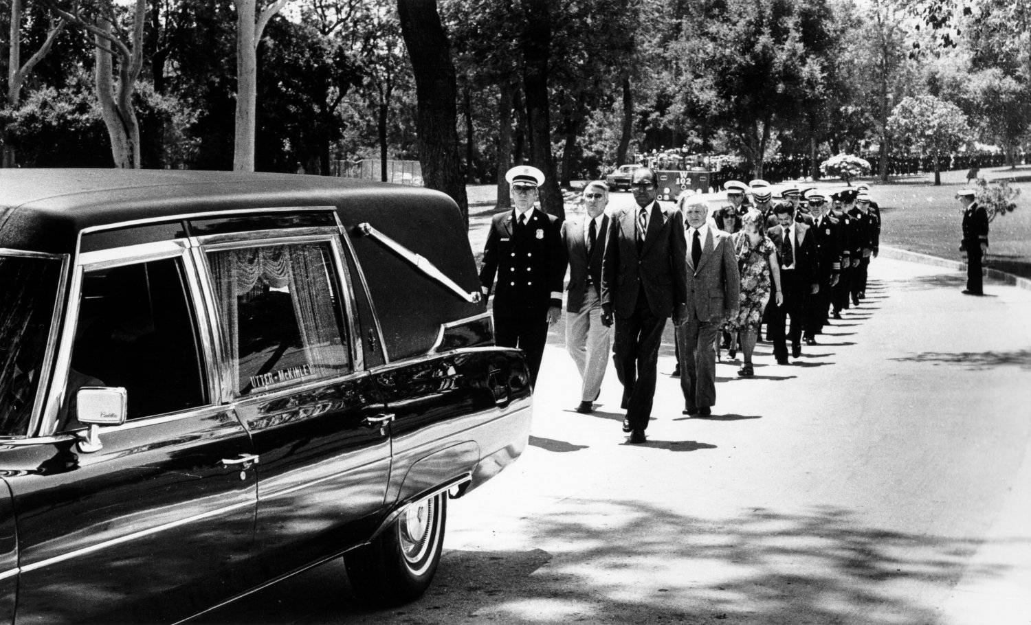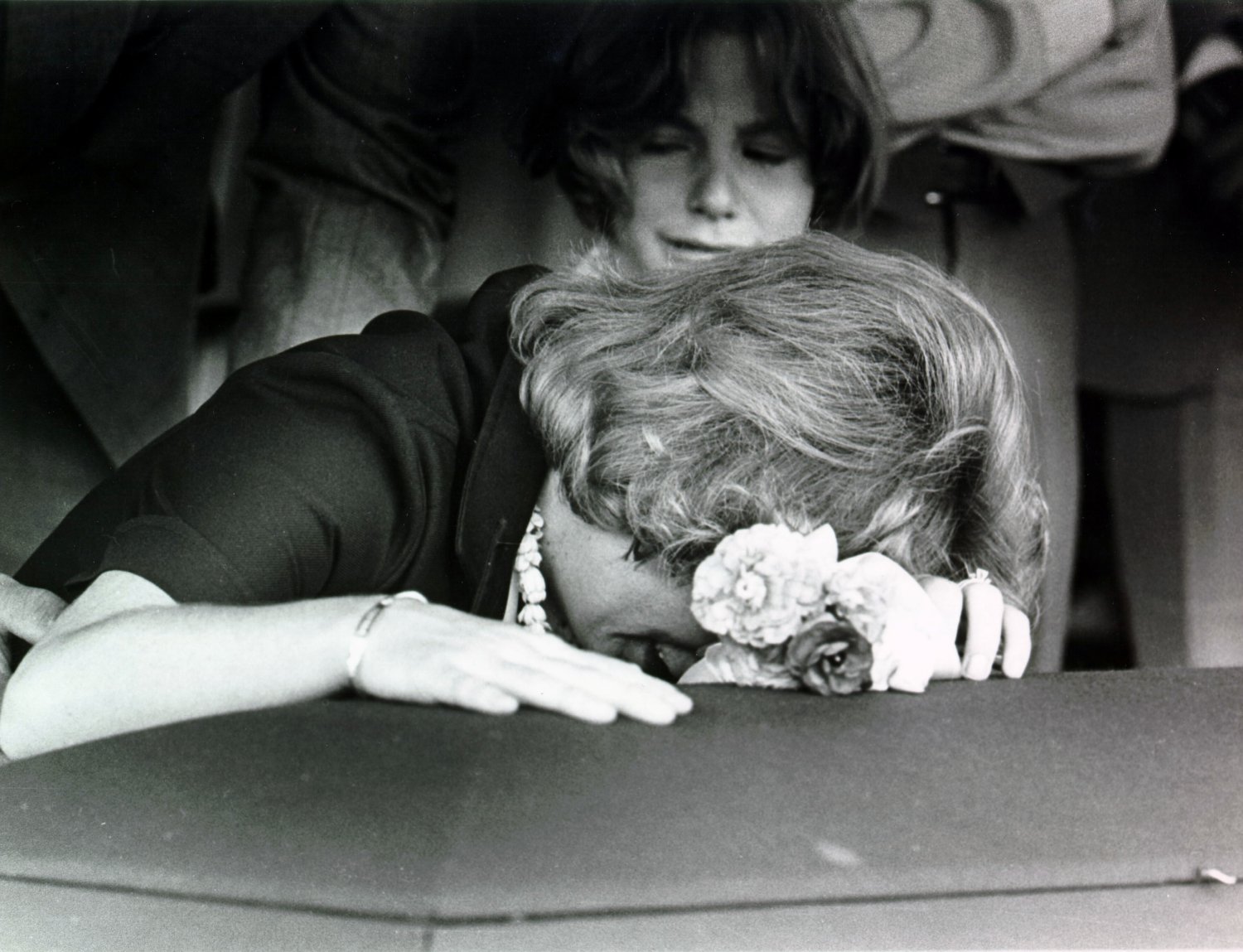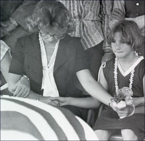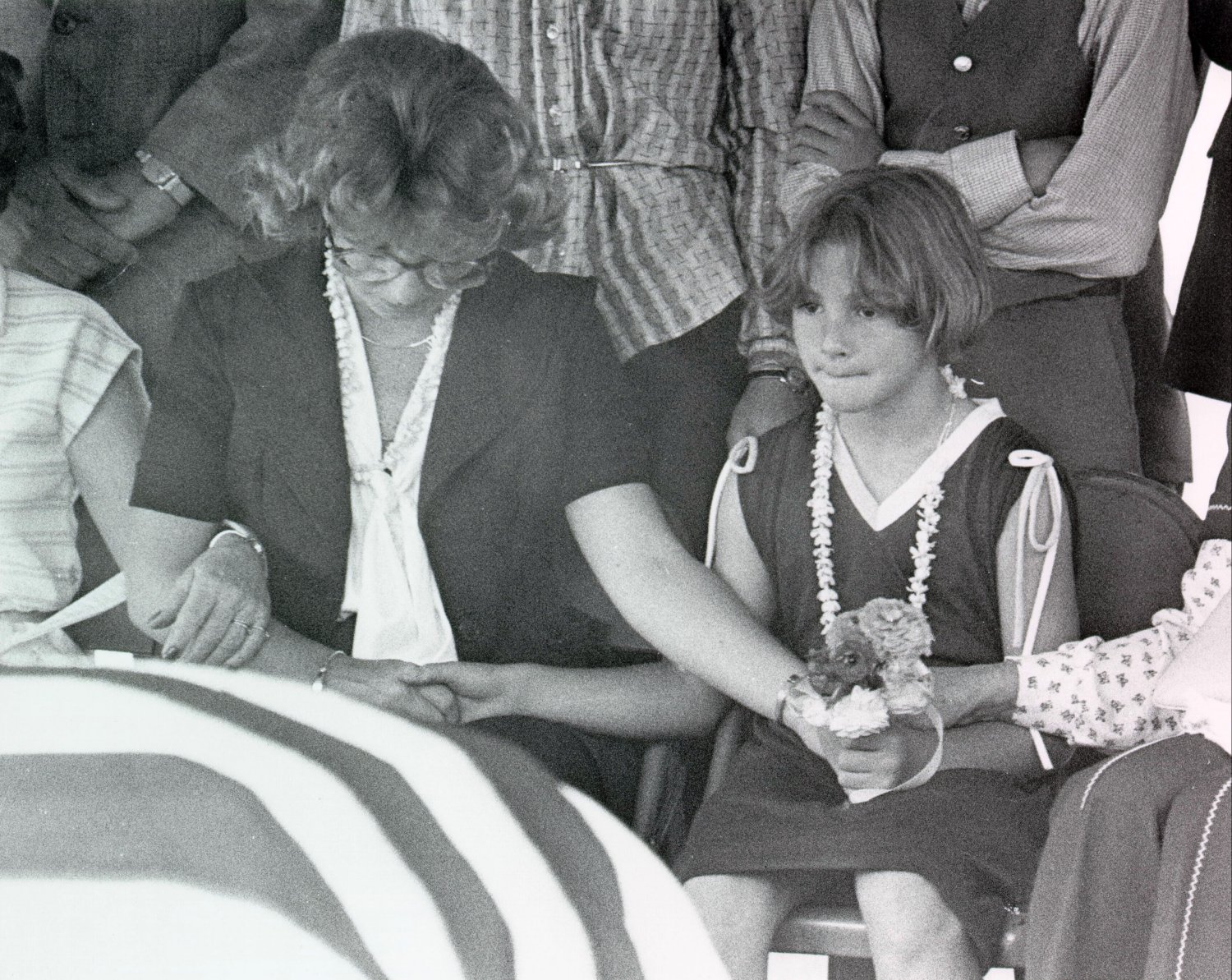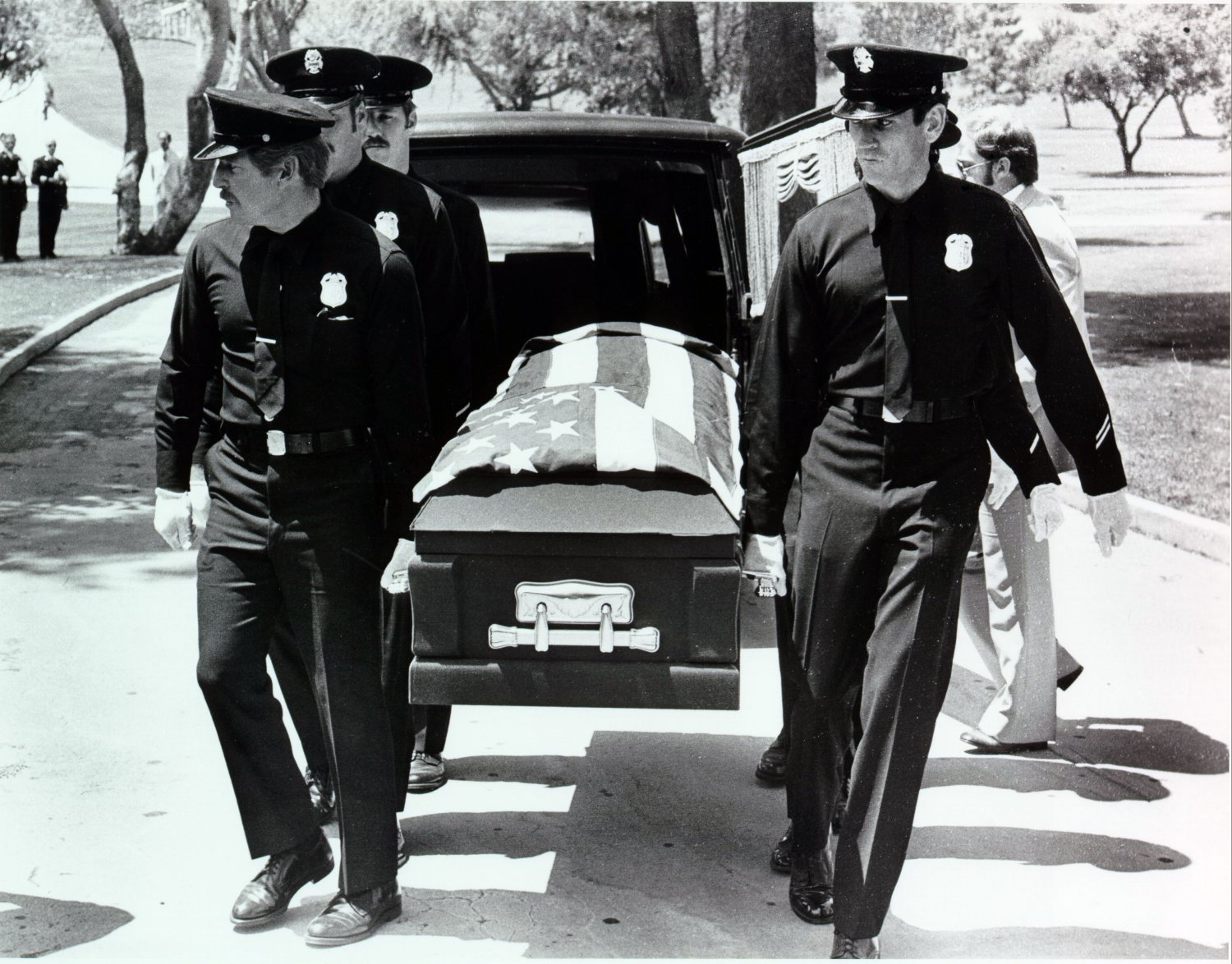 on the casket of her husband, Brian, a Los Angeles city fireman who died