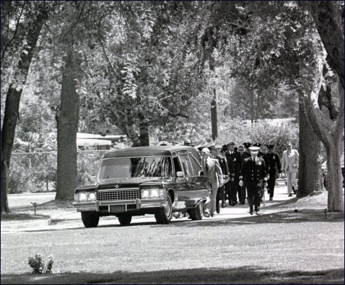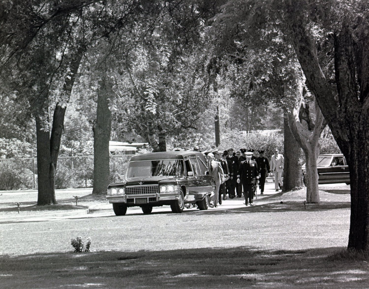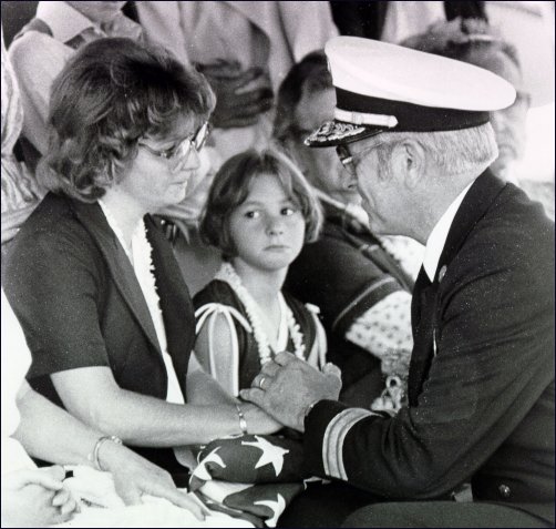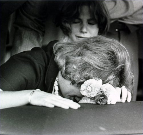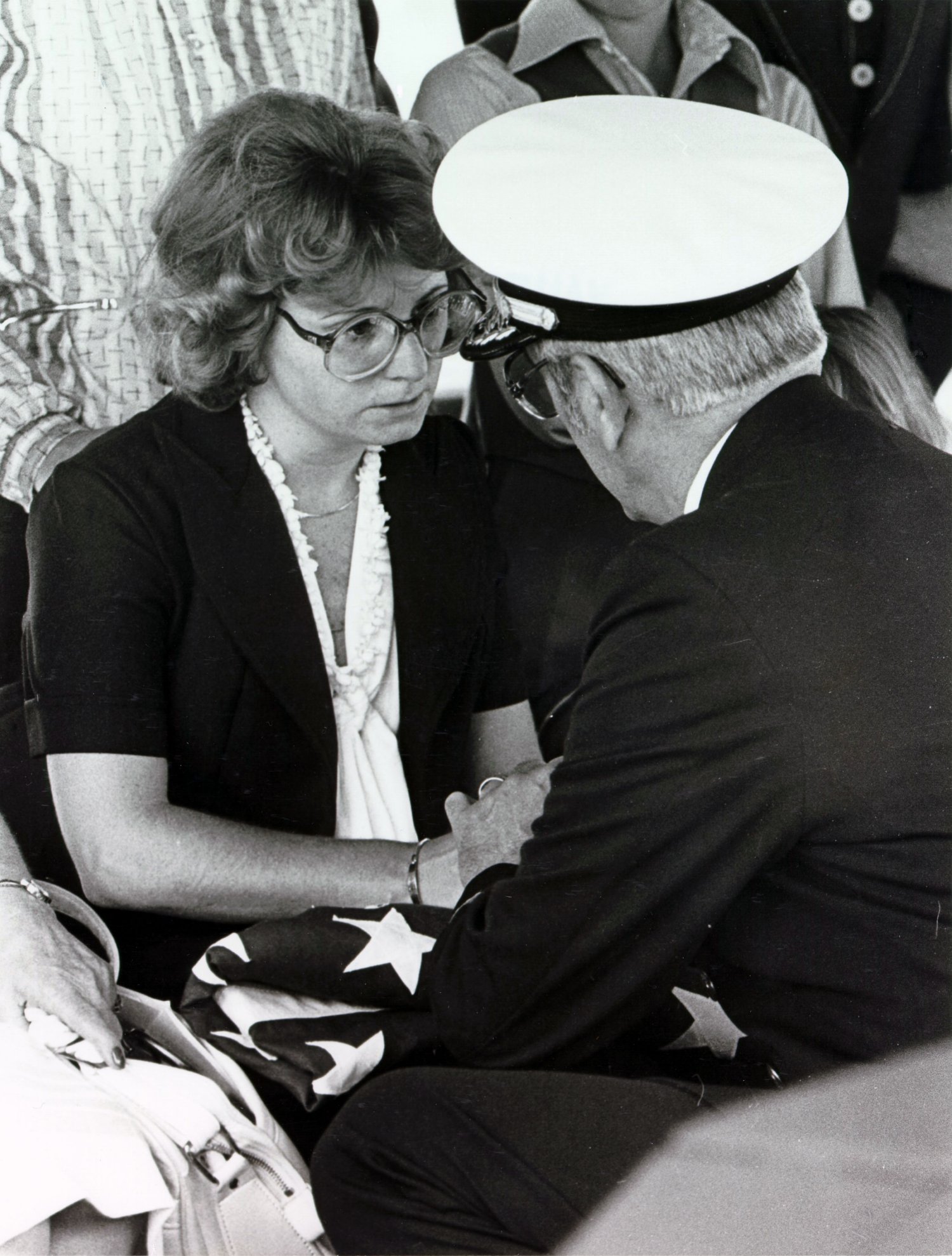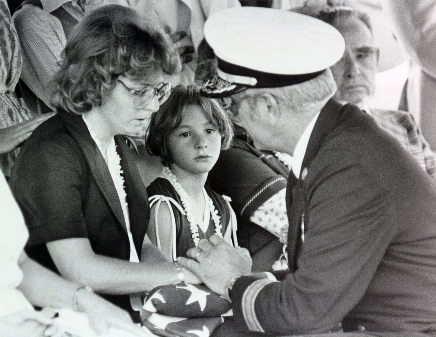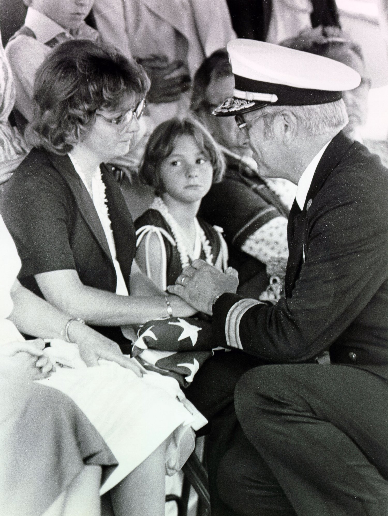 on the casket of her husband, Brian, a Los Angeles city fireman who died