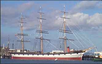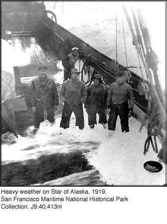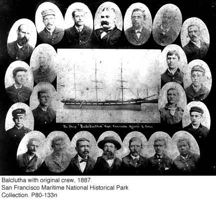 British Deepwaterman On January 15, 1887, with a twenty-six-man crew, Balclutha sailed under British registry from Cardiff, Wales, on her maiden voyage. She was bound for San Francisco. The ship entered the Golden Gate after 140 days at sea, unloaded her cargo of 2,650 tons of coal, and took on sacks of California wheat. This photo, ringed by portraits of Captain Constable and his crew, was taken on San FranciscoBay in June, 1887. Because of the months-long ocean voyage, Balclutha made only one round-trip per year while engaged in the Europe-to-San Francisco grain trade. She arrived with a cargo three times, but also brought pottery, cutlery, Scotch whisky (from Glasgow and Liverpool) and "Swansea general" (tinplate, coke and pig iron) to San Francisco. During the mid-1890s the ship called at other ports around the world; in New Zealand, for example, she loaded wool and tallow for London, England. In 1899 Balclutha was transferred to Hawaiian registry, and she joined the bustling Pacific Coast lumber trade. For three years the ship sailed north to Puget Sound, Washington, and then across to Australia. Much of the 1.5 million board feet she could carry ended up underground, used for mining timbers in the Broken Hill Mine at Port Pirie, Australia. Balclutha was the last vessel to fly the flag of the Hawaiian Kingdom. In 1901 a special act of the United States Congress admitted the ship to American registry so that she could engage in "coastwise" trade (i.e. between American ports). Soon thereafter, the Alaska Packers Association, a San Francisco firm which harvested and canned salmon, chartered her to carry men and supplies north – to Alaska. Salmon Packet When Balclutha went aground in 1904, the Alaska Packers Association purchased her where she lay for the non-princely sum of $500. After extensive repairs, they renamed her Star of Alaska (all Packer iron and steel sailing vessels had a "Star" prefix to their names). During this career, the ship sailed up the West Coast from Alameda, California, carrying supplies and cannery workers. Star of Alaska anchored out in Chignik Bay, Alaska, during April. After the supplies were unloaded and the cannery workers had settled into the company’s camp ashore, only a shipkeeper or two remained on board. In early September, her hold packed with cases of canned salmon, Star of Alaska started the 2,400-mile voyage back to San FranciscoBay. She was considered a fast sailer, averaging better than twenty-two days for the trip north and fifteen days when homeward bound. This photo, taken in 1919, shows a bit of heavy weather aboard Star of Alaska. During the winter the ship was laid up with the rest of the Packer’s fleet of thirty-odd vessels in Alameda, where shipwrights performed maintenance and renovation. In 1911, the poop deck was extended to house Italian and Scandinavian fishermen. Later, additional bunks were added in the ‘tween deck for Chinese cannery workers. As Balclutha, the ship carried a crew of twenty-six men; on Star of Alaska, over 200 men made the trip north. Star of Alaska was the only sailing ship the Packers sent north in 1930, and when she returned that September she, too, was retired. Movie Star Frank Kissinger purchased Star of Alaska in 1933 (for $5,000) and renamed her Pacific Queen. Kissinger took the ship south and, while anchored off Catalina Island, she appeared in the film Mutiny on the Bounty (Clark Gable and Charles Laughton also appeared in supporting roles). For a time thereafter, Kissinger towed her up and down the West Coast, usually exhibiting her as a "pirate ship." Pacific Queenslowly deteriorated, and she barely escaped World War II scrap metal drives. Restoration In 1954 the San Francisco Maritime Museum purchased Pacific Queen for $25,000. Assisted by donations of cash, materials and labor from the local community, the Museum restored the vessel and returned her original name. The ship was transferred to the National Park Service in 1978, and Balclutha was designated a National Historic Landmark in 1985. The Grain Trade The ‘49ers panned for fortunes in mountain streams, but less then twenty years later farmers discovered California’s real wealth: its hot, fertile valley floor. Soon horse-drawn wagons laden with sacks of wheat rolled from the fields to landings on the Sacramento and San Joaquin rivers. Steam-driven sternwheel boats and railroad boxcars hauled the 100-pound bags along the Carquinez Straits to Port Costa, where deepwatermen (large, ocean-going vessels like Balclutha) loaded. California’s grain crop drew hundreds of British vessels through the Golden Gate each year. The hard dry California wheat traveled the 14,000 nautical miles to Liverpool unusually well, and the amber grain always brought a high price. The many ships coming to load grain resulted in low shipping rates for imported coal and other incoming goods and materials. Like the Gold Rush, the grain trade shaped California’s future. The lowered cost of high-quality coal spurred the growth of manufacturing and transportation. The easy access to international markets won California a measure of independence from the East Coast, and the railroads. In banking, in shipping, and in agriculture the grain trade attracted investment and created jobs. The demand for grain sacks alone pumped $2 million per year into the local economy (growers paid 10-15 cents apiece for the bags that Chinese workers wove from Calcutta jute). The Life The long months at sea made for a hard and lonely existence. Crewmen, hired by the voyage and not paid until the voyage ended, were often "encouraged" to jump ship (without pay, of course). Only the captain, who commonly stayed with a ship for many voyages, had any measure of job security. And only the captain, whose wife sometimes accompanied him, had any opportunity for family life. On Balclutha's last voyage under the British flag, Captain Durkee’s wife, Alice, gave birth to a daughter. They named the l